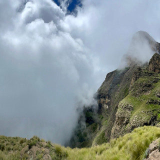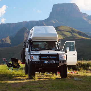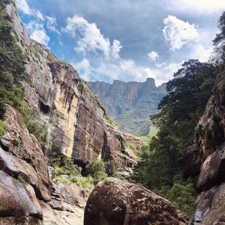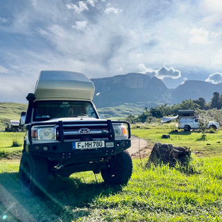 Heute geht‘s weiter in die nördlichen Drakensberge ins Mahaicamp. Der Campingplatz hat eine tolle Lage und ist ein perfekter Ausgangspunkt für Wanderungen. Wir unternehmen eine lange Wanderung in eine Schlucht, über Wiesen und durch Urwald. In der Schlucht geht es von Stein zu Stein über einen Fluss. Von einem Aussichtspunkt können wir auf den höchsten oder zweithöchsten, da ist man sich wohl nicht einig, Wasserfall der Welt schauen - den Tugelafall.